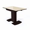 Небольшой раскладной стол для кухни.  Каркас – качественные ДСП, столешница прямоугольной формы из МДФ и матового или глянцевого закаленного стекла имеет размер 110 см, легко раскладывается до 140 см. Опирается стол на одну устойчивую ногу, переходящие в две плоские опоры на полу, что гарантирует устойчивость и надежность конструкции.